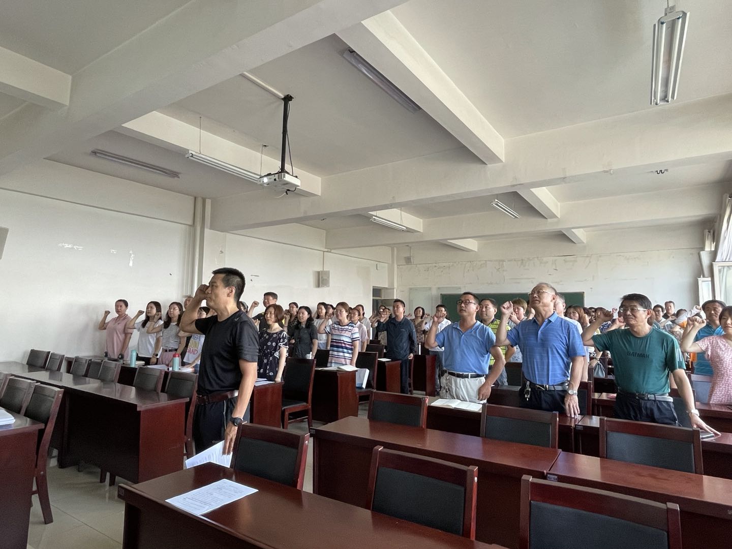 仪式上,王玉泉书记带领全体师生紧握右拳,面向国旗庄严宣誓:“我志愿成为一名人民教师,拥护中国共产党的领导,忠诚党的教育事业,铸师魂、修师德、树师表……”,用铿锵有力的声音许下了自己的坚定承诺。