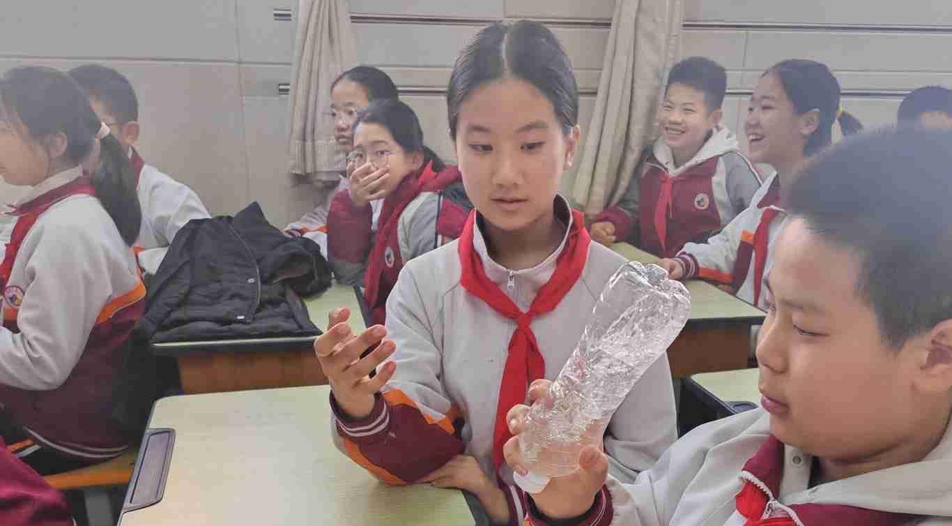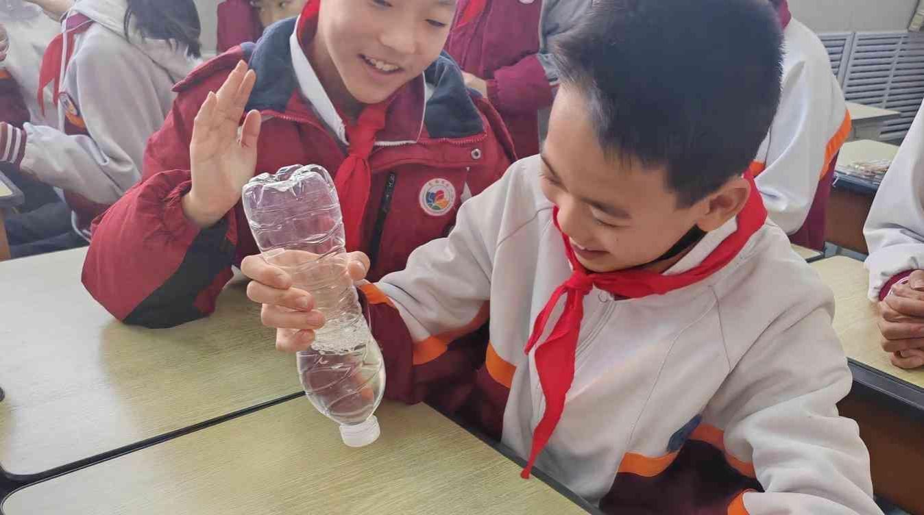 在同学们对董汉的生动讲解意犹未尽之时,刘洋同学又接力带来了有关飓风的科普知识。结合动画演示,刘洋对龙卷风的形成原理进行了详细的讲解。为了让同学们更好的理解龙卷风的形成,刘洋还手把手教小学生们如何在小小的矿泉水瓶中制造出“水龙卷”。介绍了龙卷风带来的危害后,刘洋又生动地讲述了面对大灾大难时全国各地迅速集结力量支援灾区的事迹,这让学生们体会到灾害面前全国人民众志成城、共克时艰的精神,领悟到一方有难八方支援的行为背后是强烈的爱国主义情怀与集体主义精神。